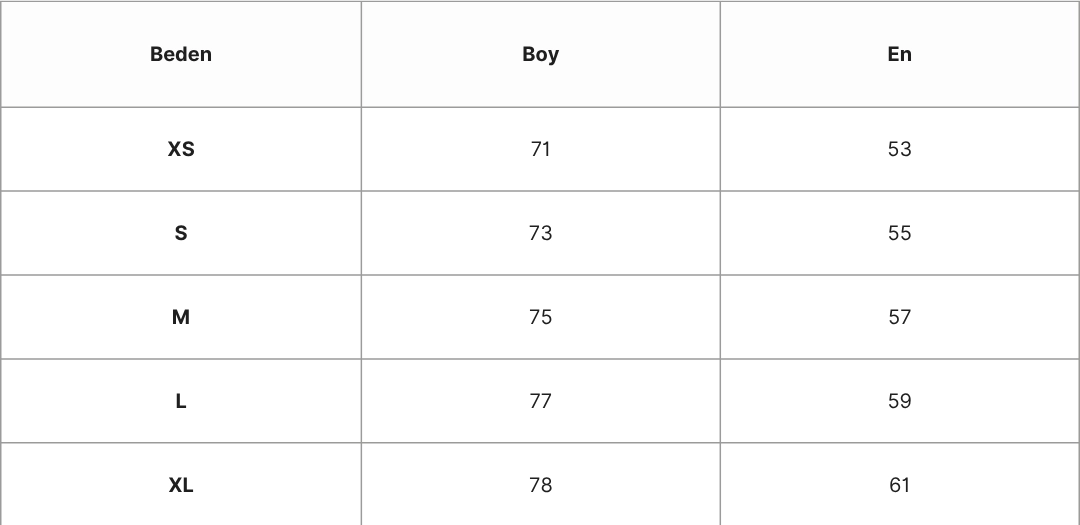 Kendi bedeninizi almanızı öneririz. Detaylı ölçüler için beden tablosunu inceleyebilirsiniz. Emin olamadığınız noktada bizimle iletişime geçebilirsiniz.